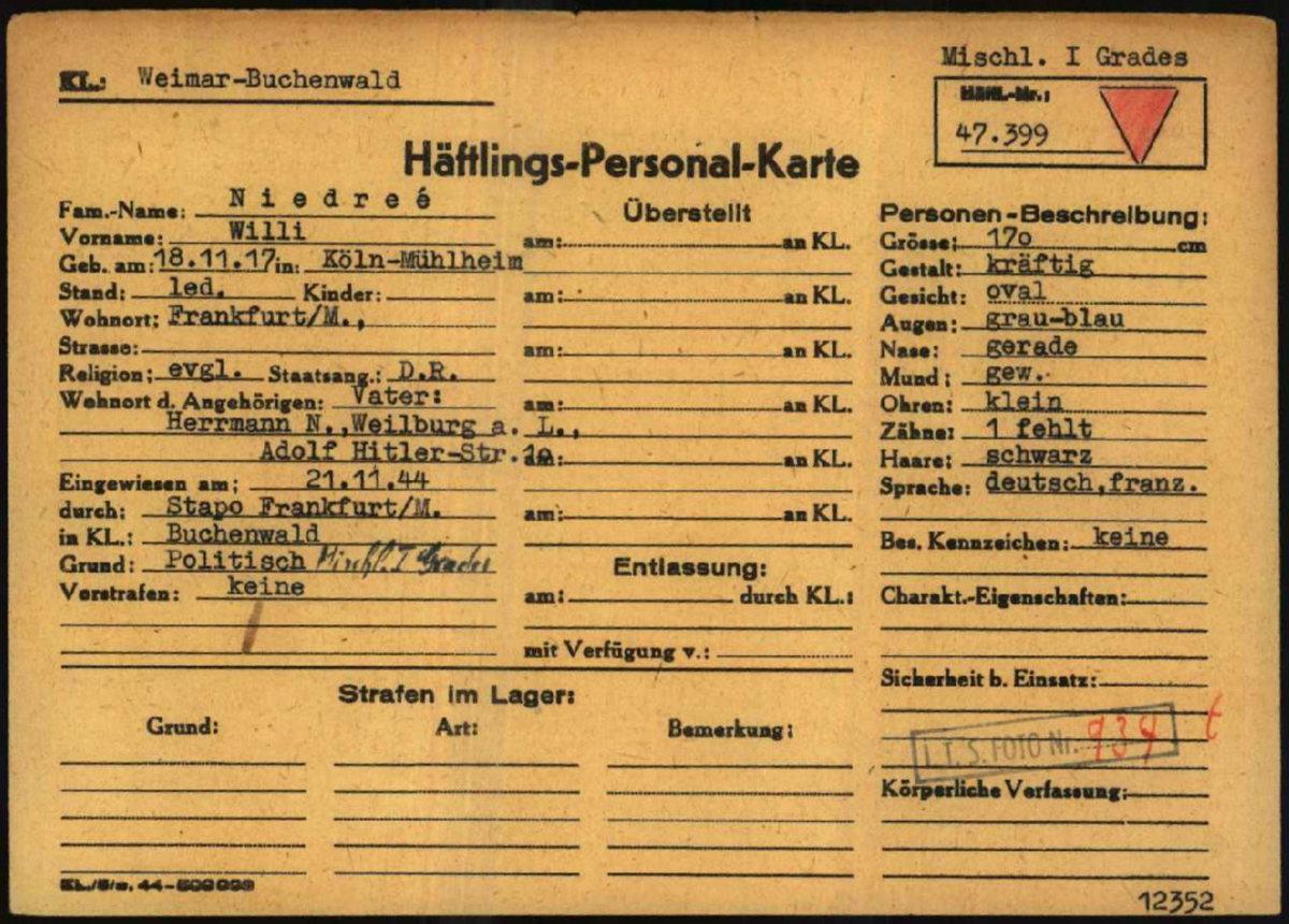 Ende März 1944 kam Willi nach fast sechsjähriger Abwesenheit für kurze Zeit nach Weilburg zurück und wohnte bei seinem Vater im Hause Neugasse 10. Schon drei Tage nach seiner Ankunft berichtete die Weilburger Polizei dem Bürgermeister über Willis Anwesenheit: Willi lungere nur herum, sein Nichtstun habe schon Aufsehen erregt. Es bestehe die Gefahr, dass er sich ein „arisches“ Mädchen „gefügig mache“. Er habe bereits 2 (!) uneheliche Kinder. Es sei deshalb dringend erforderlich, dass er umgehend einen Arbeitsplatz angewiesen bekomme und dass er „vielleicht in einem Lager“ untergebracht werde. Willi kehrte umgehend nach Frankfurt zurück.