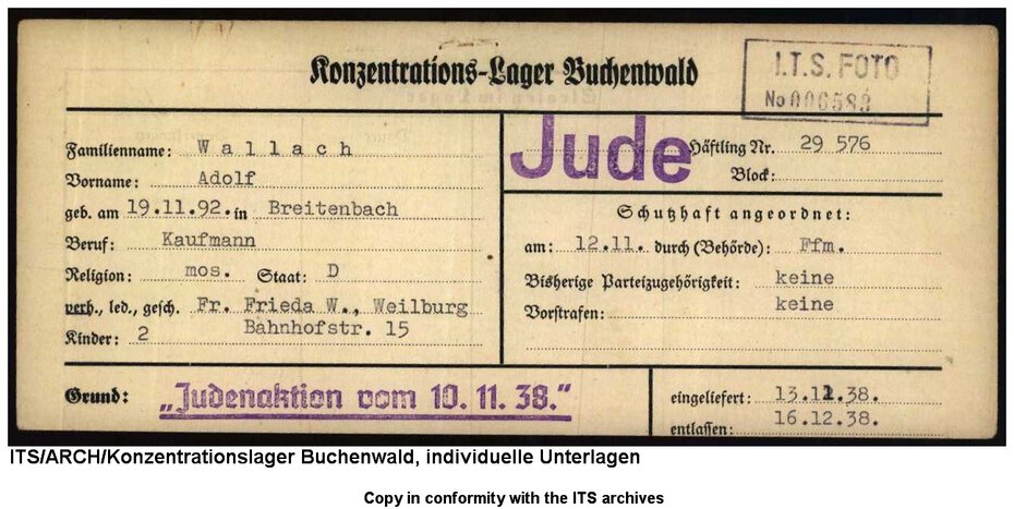 Das Novemberpogrom 1938 brach am 10. November 1938 über die wenigen noch in Weilburg lebenden Juden herein, die dem organisierten Überfall hilflos ausgeliefert waren. Ein Trupp von 5 – 6 Männern verwüstete Wohnungen und ein Geschäft in den folgenden Häusern: Limburger Straße 35, Bahnhofstraße 5 und 15, Niedergasse 6 und 10. Drei Männer (Max Falk, Jakob Erich Simon und Adolf Wallach) wurden in die Konzentrationslager Buchenwald und Dachau verschleppt.